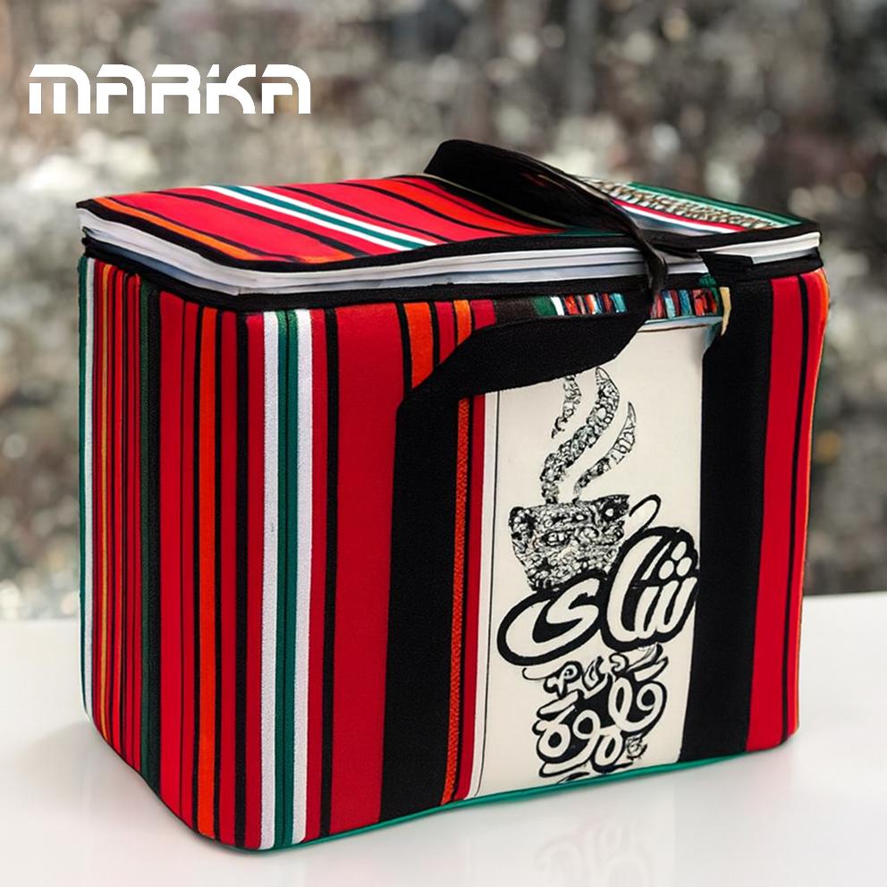 مزودة بمقبض علوي لسهولة الحمل، ورسمة فنية لكوب بخاري تضيف لمسة جمالية تعبّر عن روح الضيافة العربية.