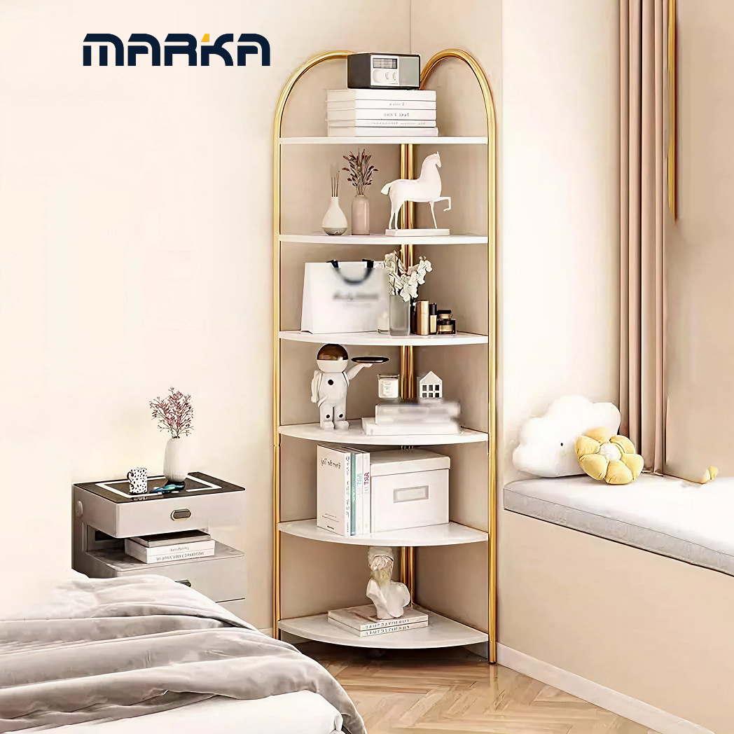 رف زاوية مفتوح بتصميم مثلثي – هيكل معدني وأرفف MDF