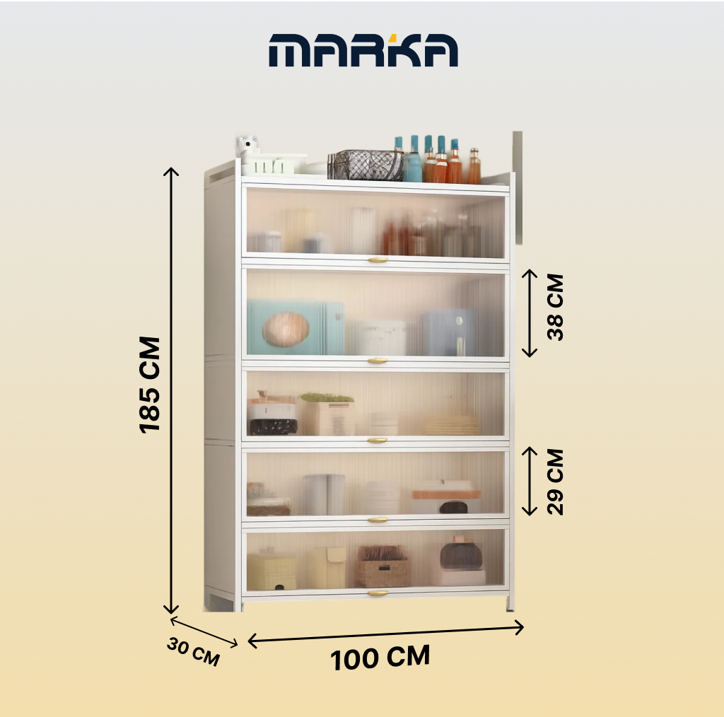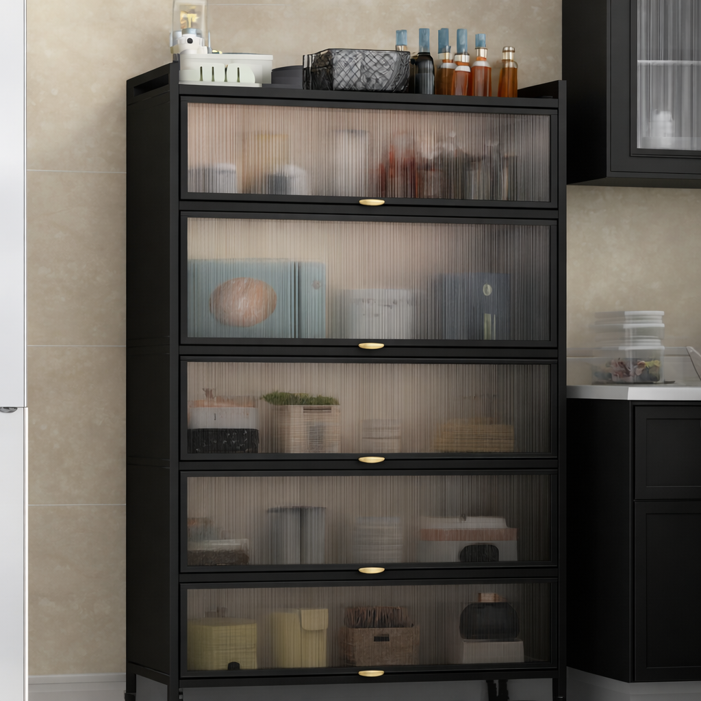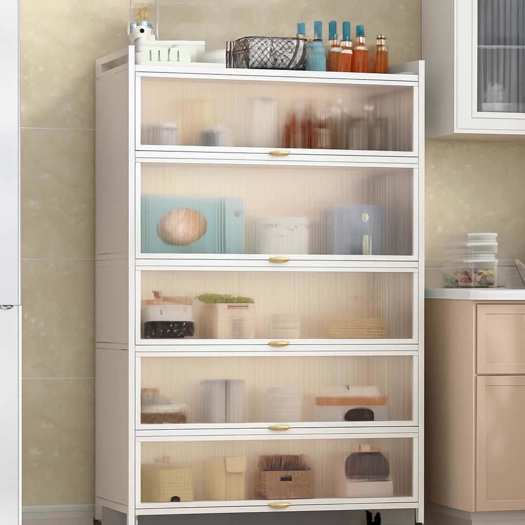خزانة مطبخ عملية بتصميم عصري، مثالية لتنظيم أدوات المطبخ، الأجهزة الصغيرة، والمواد الغذائية. مصنوعة من هيكل فولاذ كربوني متين مع ألواح PC عالية الجودة، وتتميز بأبواب شفافة لسهولة رؤية المحتويات مع الحفاظ على ترتيب وأناقة المساحة.