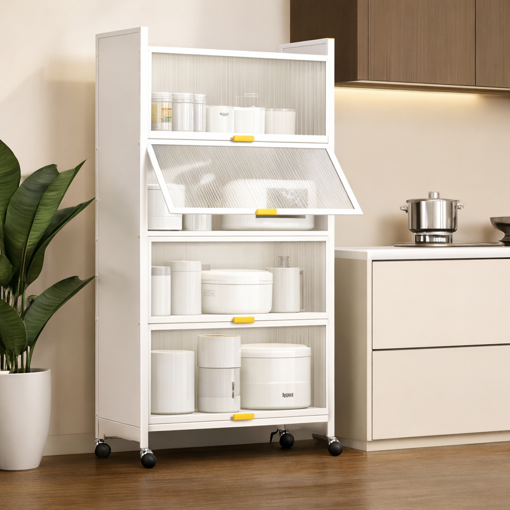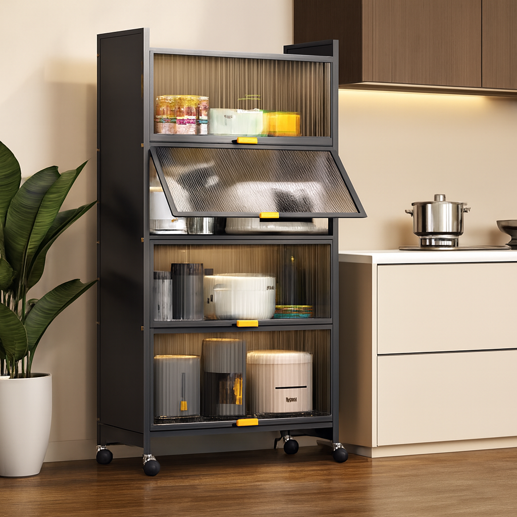 خزانة مطبخ عملية بتصميم عصري، مثالية لتنظيم أدوات المطبخ والأجهزة الصغيرة والمواد الغذائية. مصنوعة من هيكل فولاذ كربوني متين مع ألواح PC عالية الجودة، وتتميز بأبواب شفافة لسهولة رؤية المحتويات مع الحفاظ على ترتيب وأناقة المطبخ.