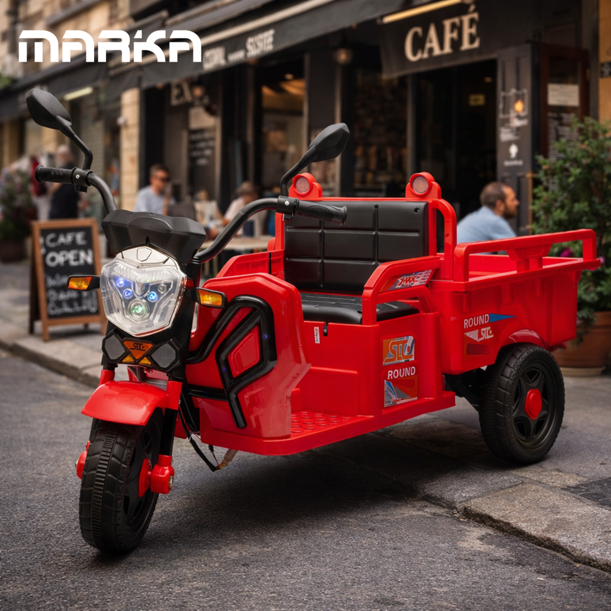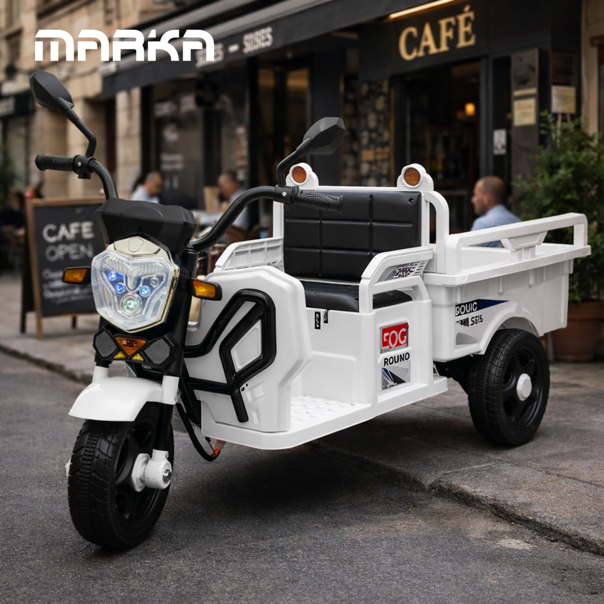 سيارة/دراجة كهربائية للأطفال بتصميم ثلاثي العجلات، توفر تجربة قيادة ممتعة وآمنة للأطفال مع إمكانية التحكم عن بُعد من قبل الأهل.