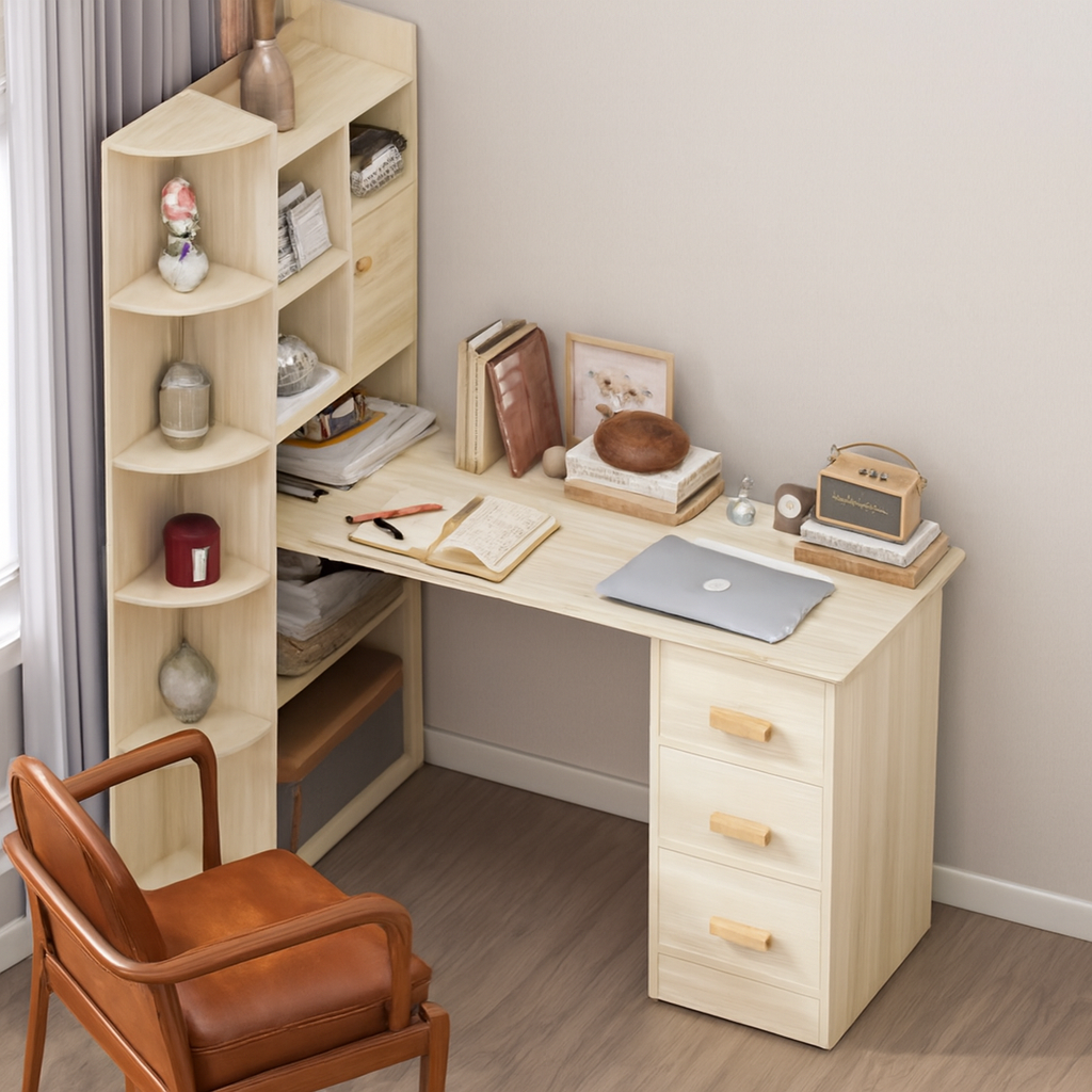 שולחן מחשב 2 ב-1 פרקטי וחכם המשלב שולחן עבודה וכוננית ספרים ביחידה אחת, אידיאלי למשרד ביתי או לחדר שינה. עיצובו בצורת L (פינה) מסייע בניצול יעיל של החלל, עם מדפי אחסון ומגירות לארגון קל של ספרים, כלים וקבצים.
