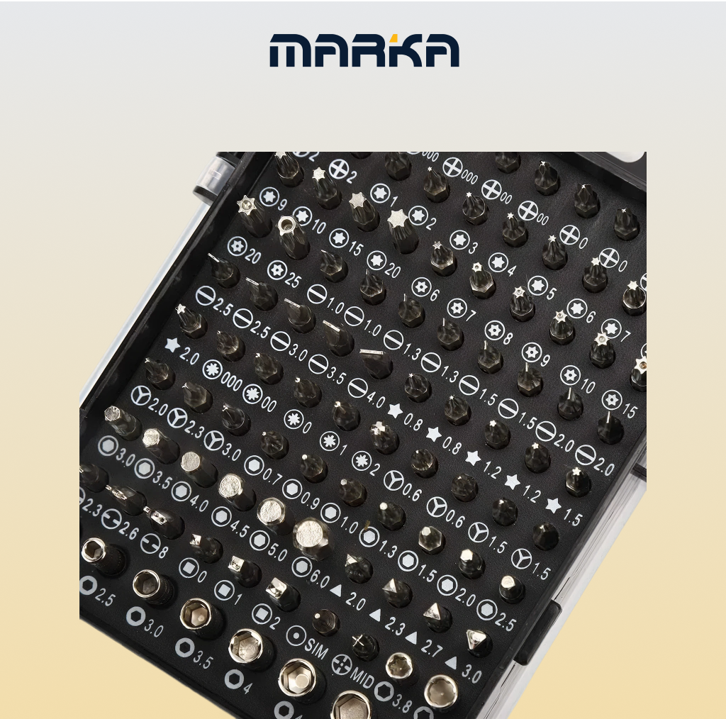 - علبة بلاستيكية متينة تحتوي على مجموعة كبيرة من رؤوس المفكات الدقيقة (Bits) بأحجام وأشكال متعددة، مرتبة بشكل منظم.