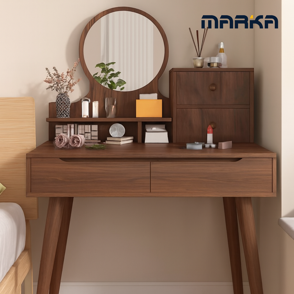 طاولة مكياج أنيقة وعملية بتصميم عصري يناسب المساحات الصغيرة، مزودة بمرآة دائرية مع إضاءة تمنحك رؤية واضحة أثناء العناية اليومية. تجمع بين الجمال والتنظيم لتكون قطعة مثالية لغرفة النوم.