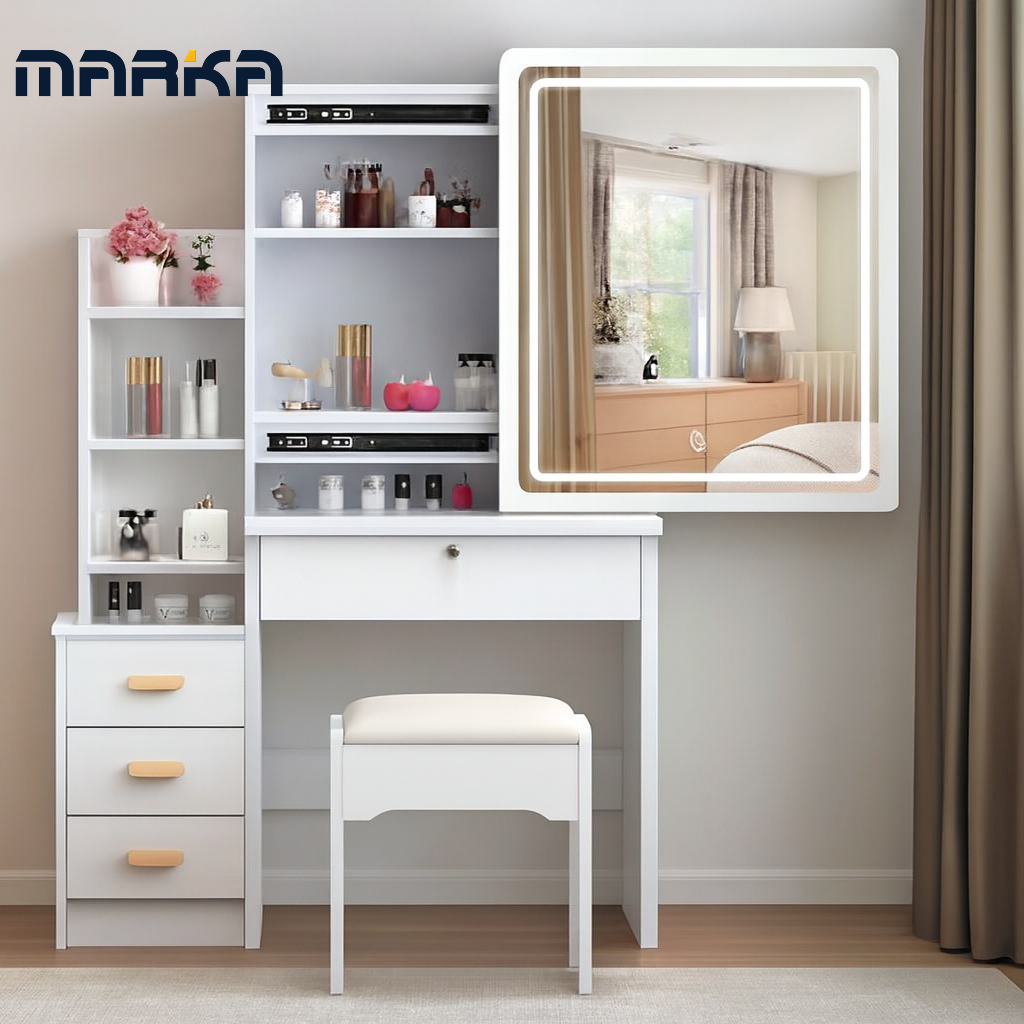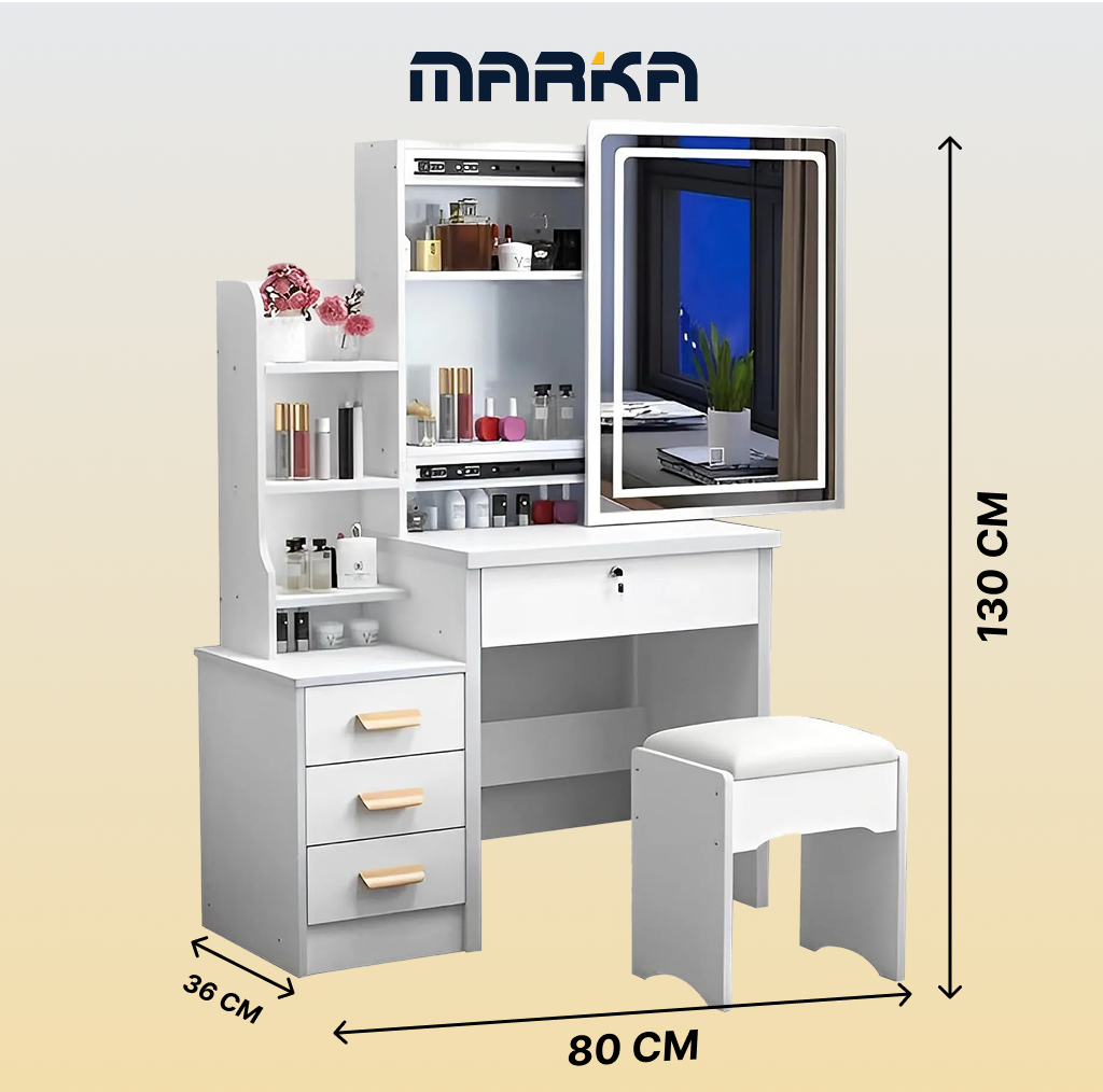 أضيفي لمسة من الأناقة والتنظيم إلى غرفتك مع طاولة المكياج العملية والمصممة لتلبية احتياجاتك اليومية. تتميز بمرآة LED تمنحك إضاءة مناسبة ودقيقة أثناء المكياج، مع تصميم عصري يناسب مختلف الديكورات.
