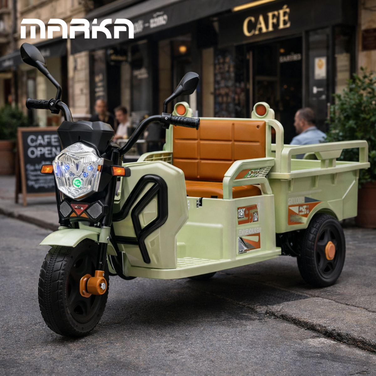 سيارة/دراجة كهربائية للأطفال بتصميم ثلاثي العجلات، توفر تجربة قيادة ممتعة وآمنة للأطفال مع إمكانية التحكم عن بُعد من قبل الأهل.
