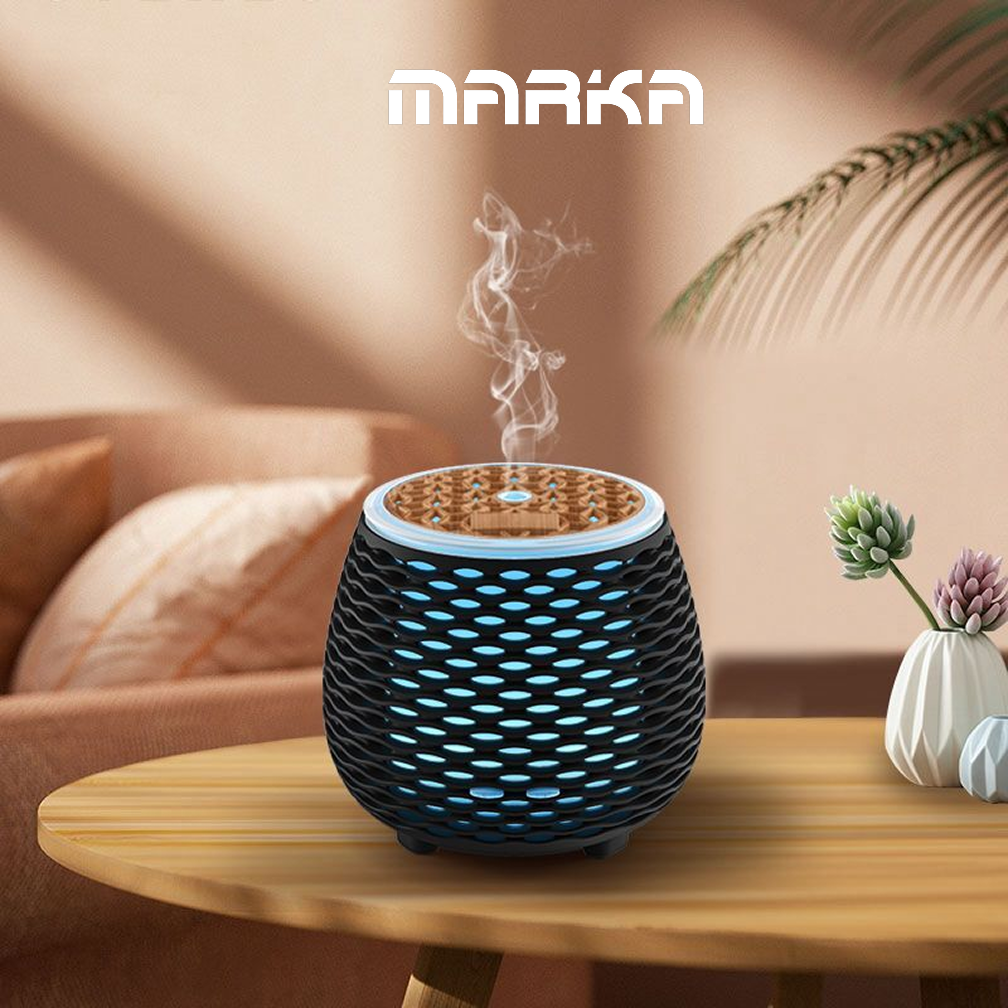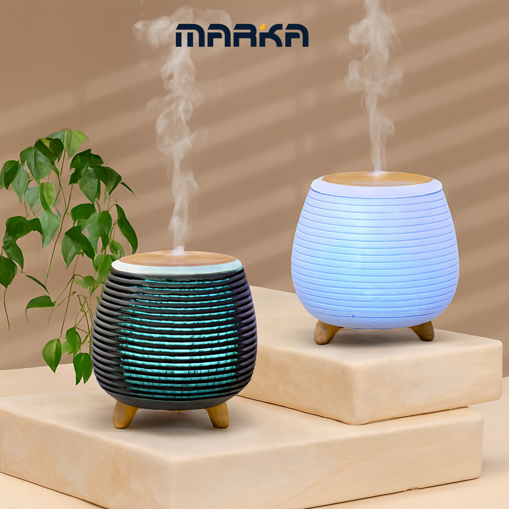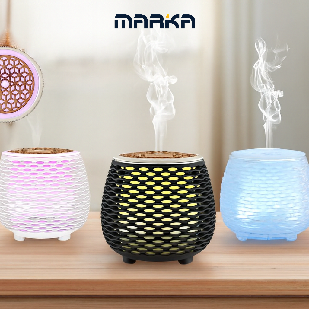 מכשיר אלגנטי שמשלב לחות לאוויר והפצת ניחוחות ארומטיים, עם תאורה מרגיעה ועיצוב מרשים שמתאים לכל חלל.