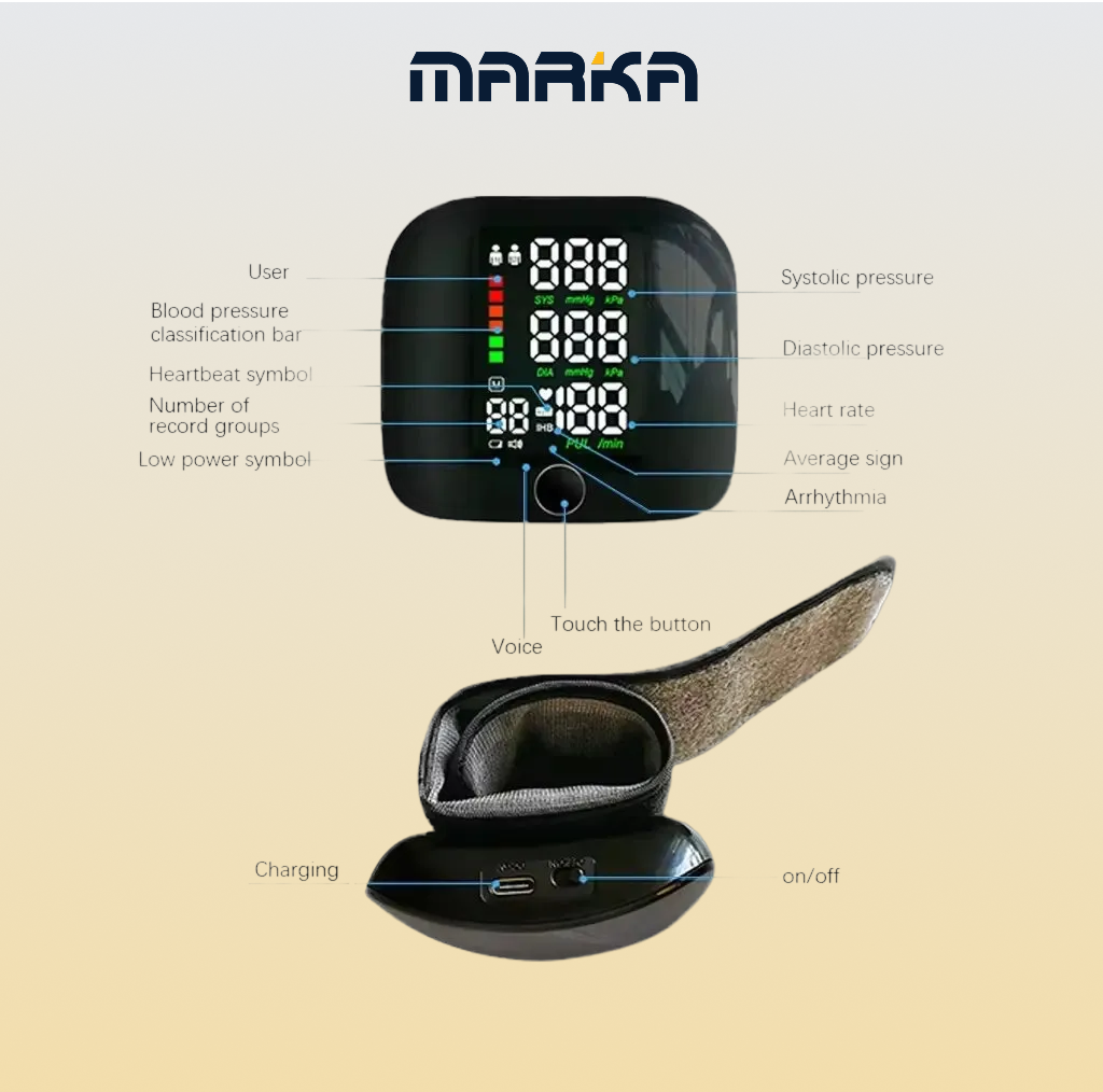 מכשיר חכם וקל לשימוש לניטור מדויק של לחץ דם בכל זמן ובכל מקום, בעל עיצוב קל משקל המתאים ללבישה יומיומית.