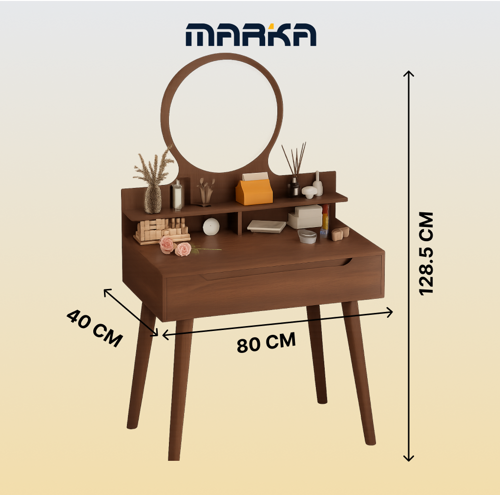 שולחן איפור מסוגנן ופרקטי בעיצוב מודרני, מושלם לחללים קטנים. הוא כולל מראה עגולה עם תאורה מובנית לנראות ברורה במהלך שגרת יומכם. שילוב יופי וארגון, זהו הפריט האידיאלי לכל חדר שינה.